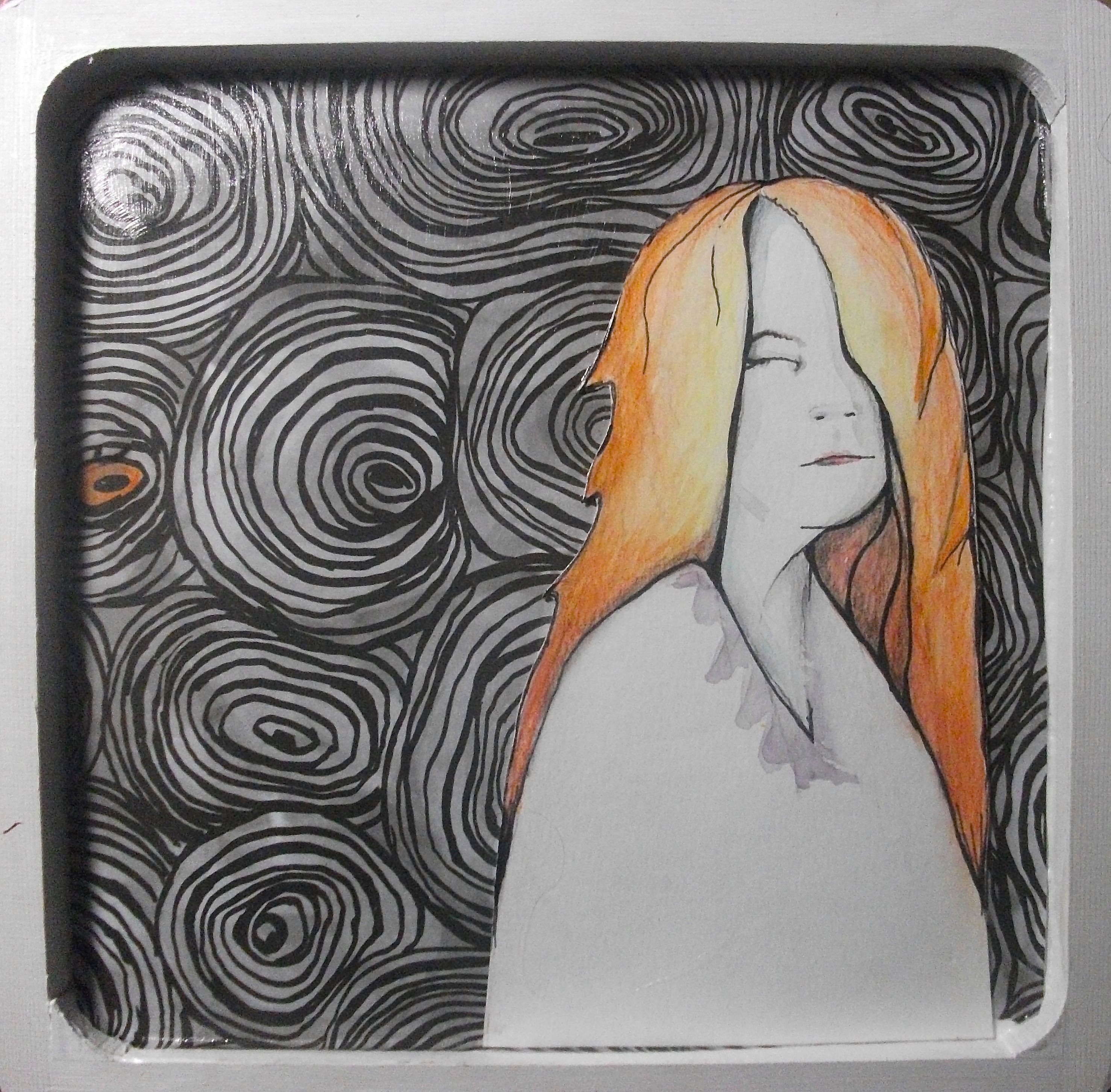 9″x 9″ framed wood panel, with watercolor & acrylic paints and decorative paper