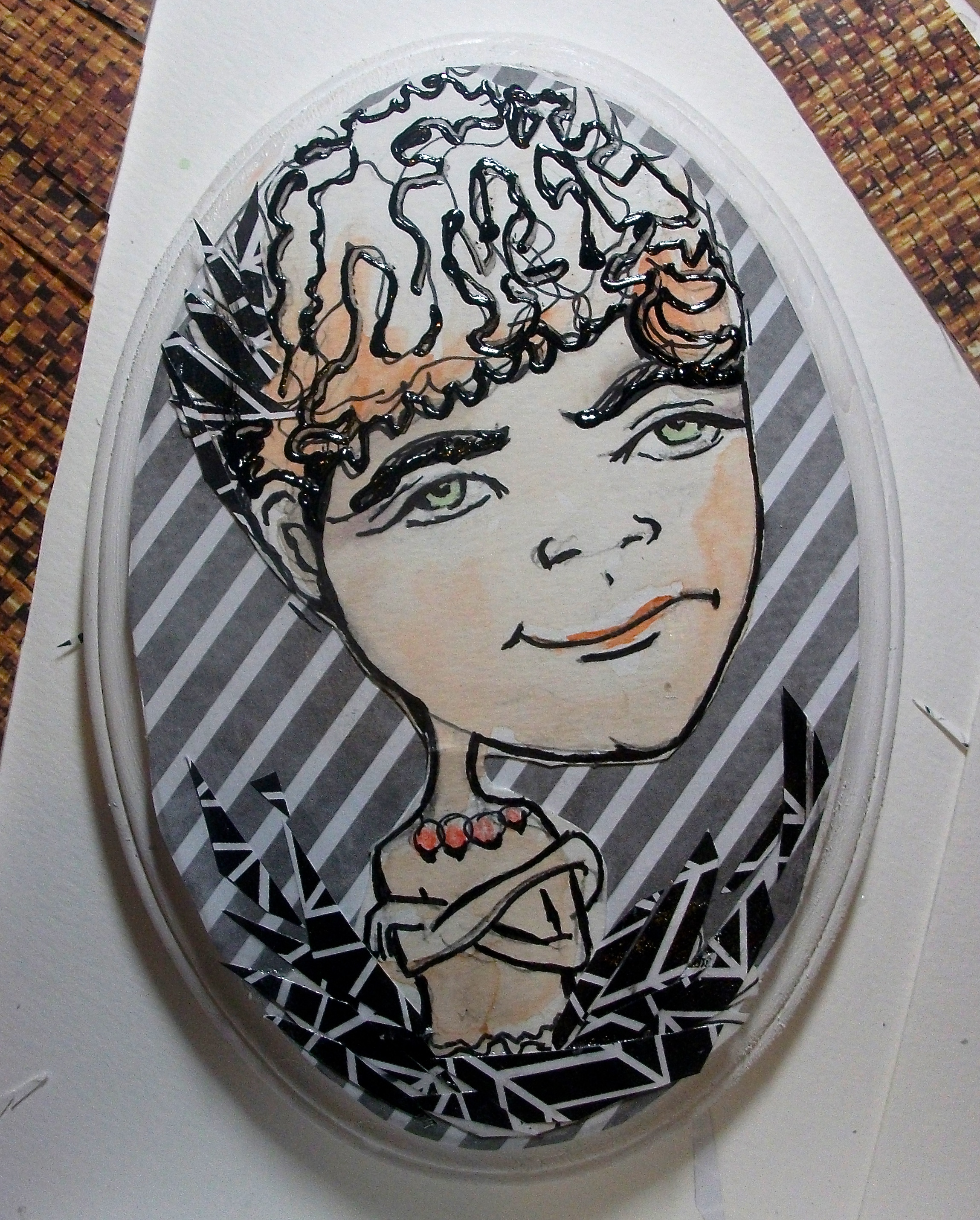 18/100 Mixed media, oval wood plaque, decorative paper, cut paper, pen, watercolor, 3-Dimensional paint, gloss medium. 100 artworks challenge