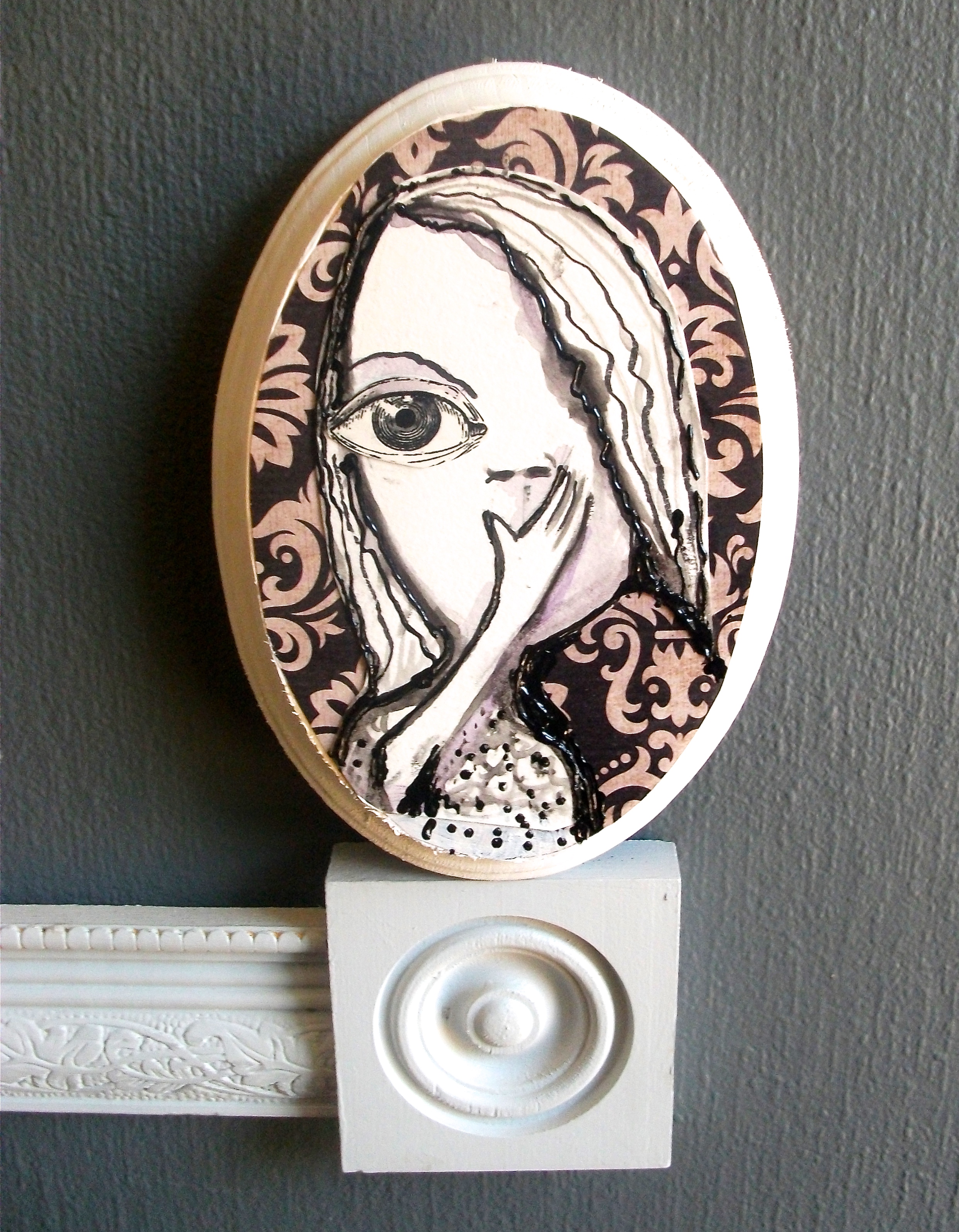 18/100 Mixed media, oval wood plaque, decorative paper, cut paper, pen, watercolor, 3-Dimensional paint, gloss medium. 100 artworks challenge