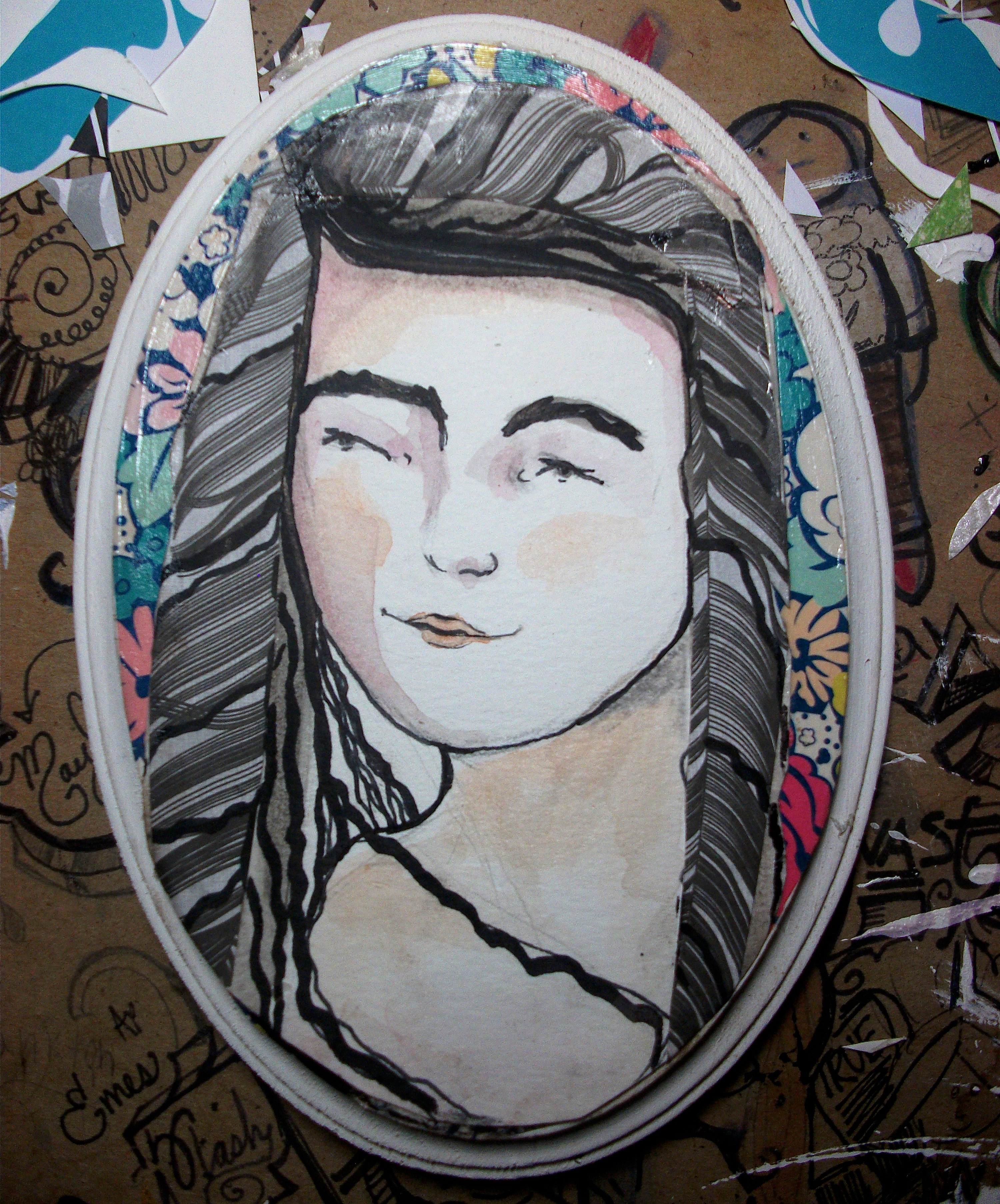 17/100 Mixed media, decorative paper, watercolor, pen, 3-Dimensional paint on oval wood plaque